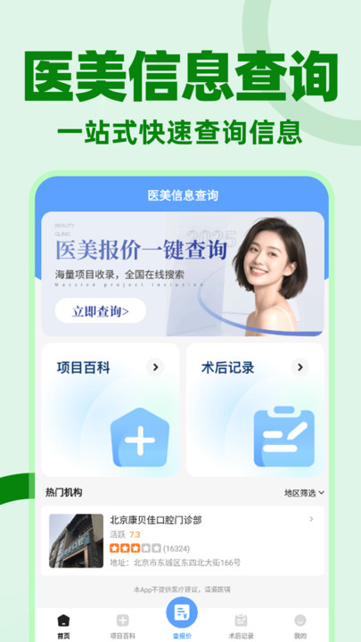 医美信息查询是一款专注于为用户提供医美信息查询服务的手机平台,平台免费开放多种查询通道,通过整合行业资源、提供透明化服务及安全保障,助力用户高效做出决策、降低医美风险,帮助大家获取医美行业各类相关资质信息。
