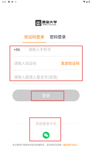 1、打开墨宝应用,在版本引导页面点击【立即体验】按钮,即可进入“墨宝大学”的登录环节。