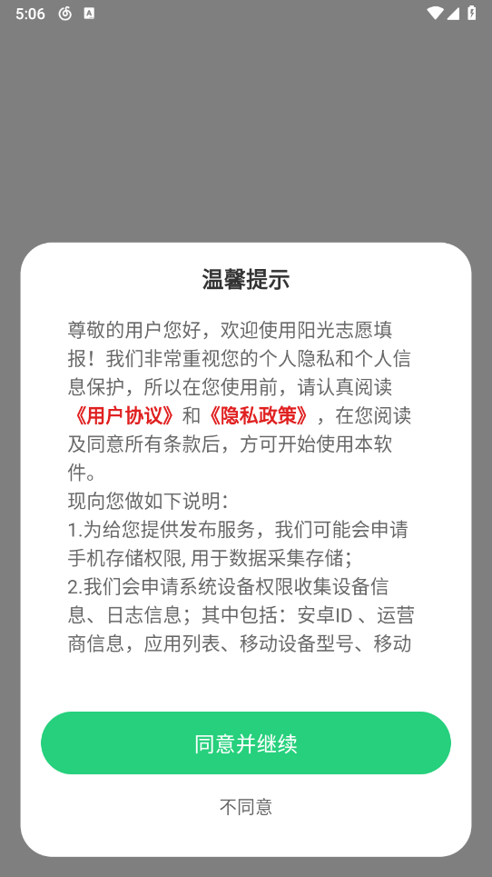 1、安装阳光志愿填报,同意相关的政策与协议。