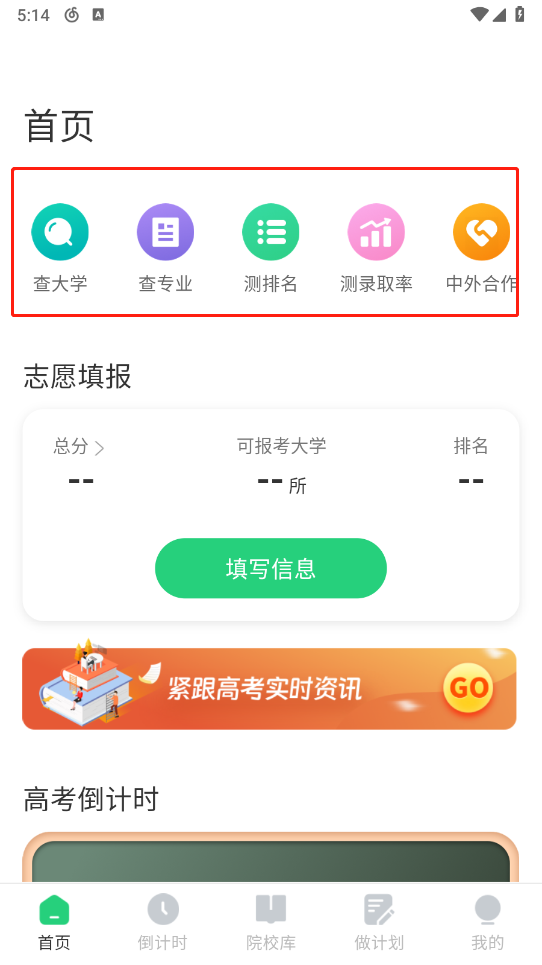 3、在首页能够查询大学、专业相关信息,还可以进行录取率测算和排名查询等操作。