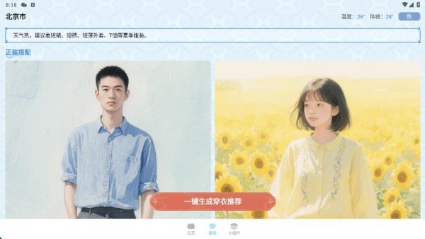 4、在穿衣页面,系统会依据天气的变化,为我们推荐各式各样的穿衣搭配模板。