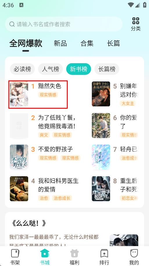 2、在新书榜单里,点击你想阅读的小说,例如《黯然失色》。