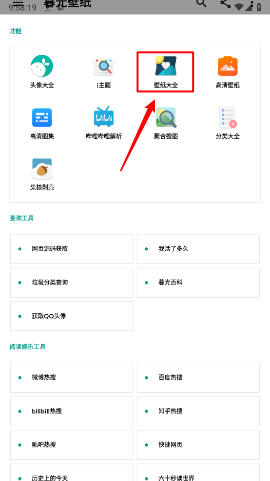 2、进入主页,点击"壁纸大全"。