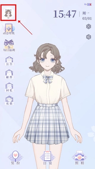 随后便会正式踏入次元世界,软件界面的操控方式与手机主界面类似。在界面的左上角,展示的是当下时间,而下方具备的功能分别为:装扮、日常以及照相。