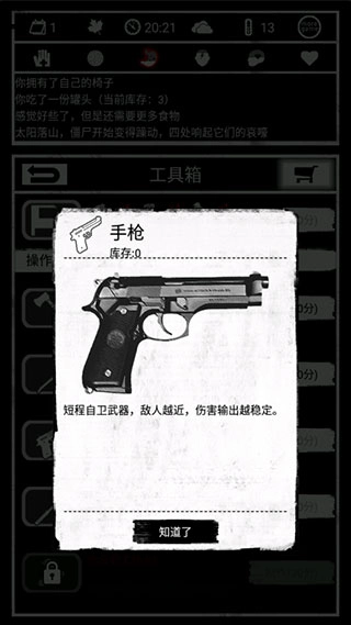 必须得说,除了两种手枪之外,其余的枪械、武士刀以及电锯,它们的交换价值相当高。然而,这类装备破损具有很强的随机性,可能用个四五次就坏了,也有可能用上十几次甚至二十几次都还完好无损。我在选择这些装备时很干脆,除了手枪、斧头和撬棍,其他的统统拿去换东西。一方面,手枪的数量足够使用,就算坏了也很容易再制作一把;另一方面,其他装备相较于手枪和斧头,性价比并没有高到哪里去,那为什么不随便拿一件去换几十个木材呢?(电锯应该能换到上百个木材)。在子弹充足的情况下,自动步枪也能派上用场,它的优势在于射速快、命中率高,能够做到无损击杀僵尸,不过相比使用手枪,它消耗的子弹更多。