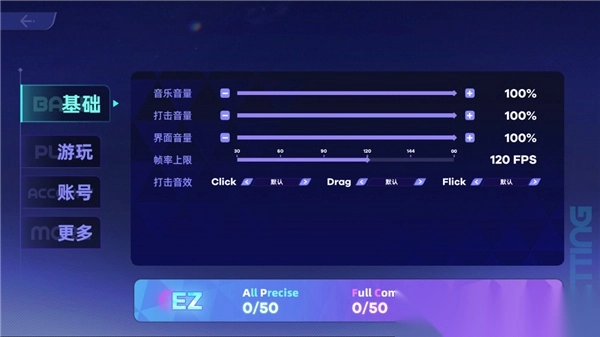4、用户可以自己设置音乐的音量、帧率上限、打击音效等等;