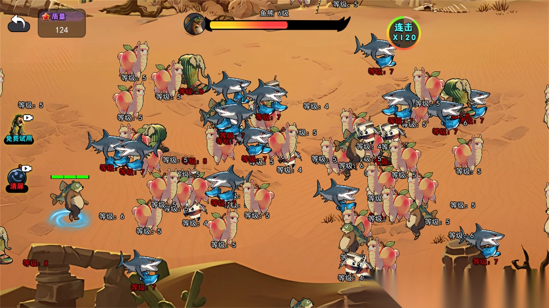 1、跑酷模式下,操控异兽在沙漠等场景狂奔,躲避障碍、吃道具,叠加连击,冲高分。