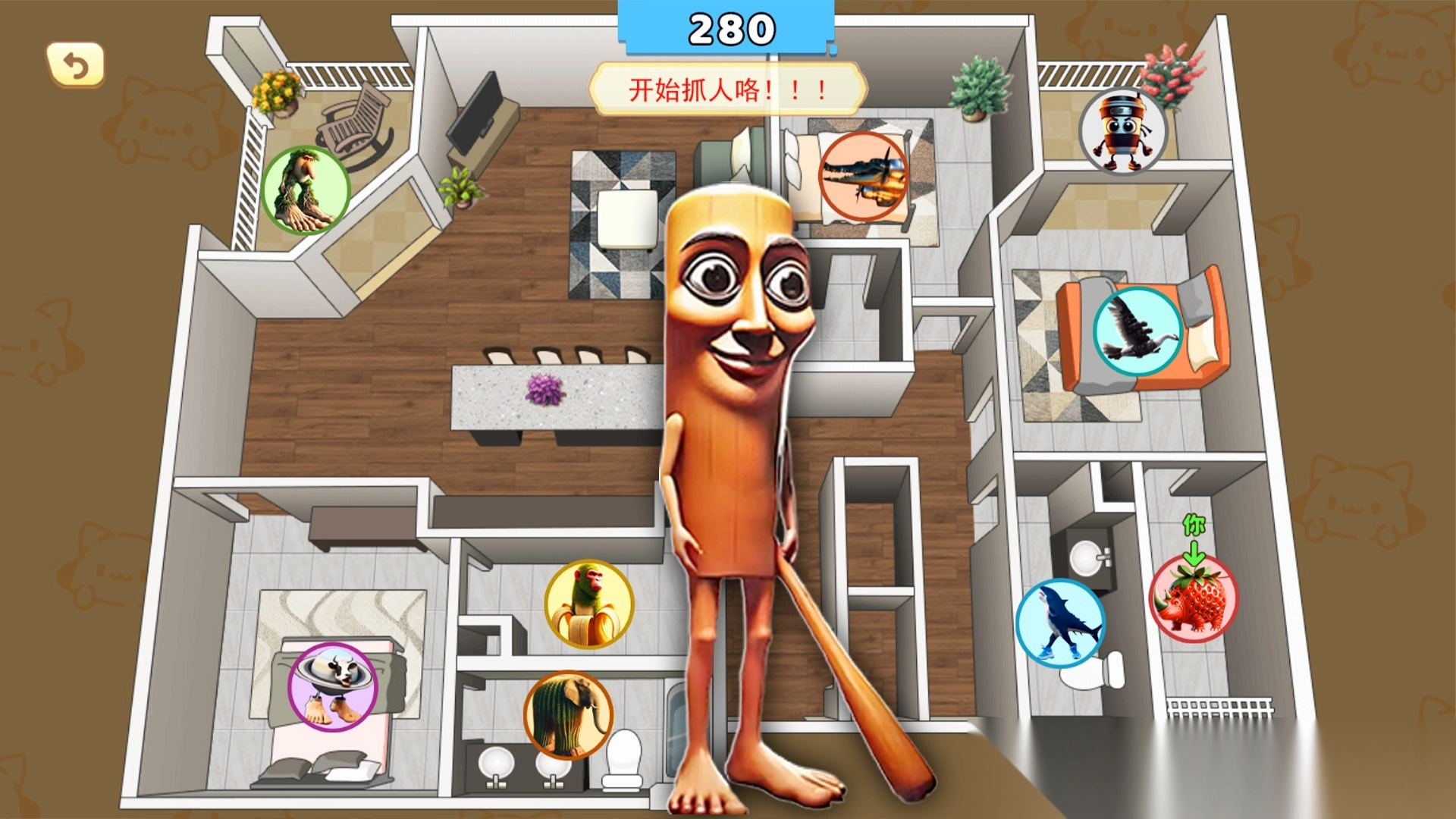 2、来体验逃脱的刺激吧!操控游戏角色,巧妙躲开手持棒球棍的追捕者。充分利用房间内的地形,灵活绕路,千万不能被抓住,努力逃出生天。