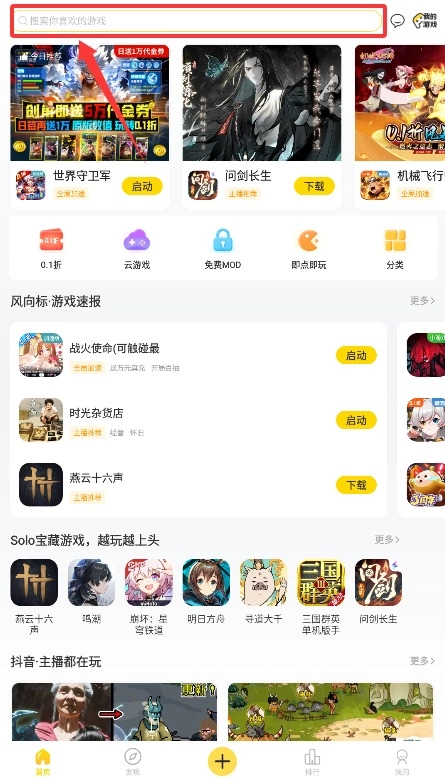 2、在首页顶部搜索栏输入游戏名称进行查找,从搜索结果中选择目标游戏进入详情页。
