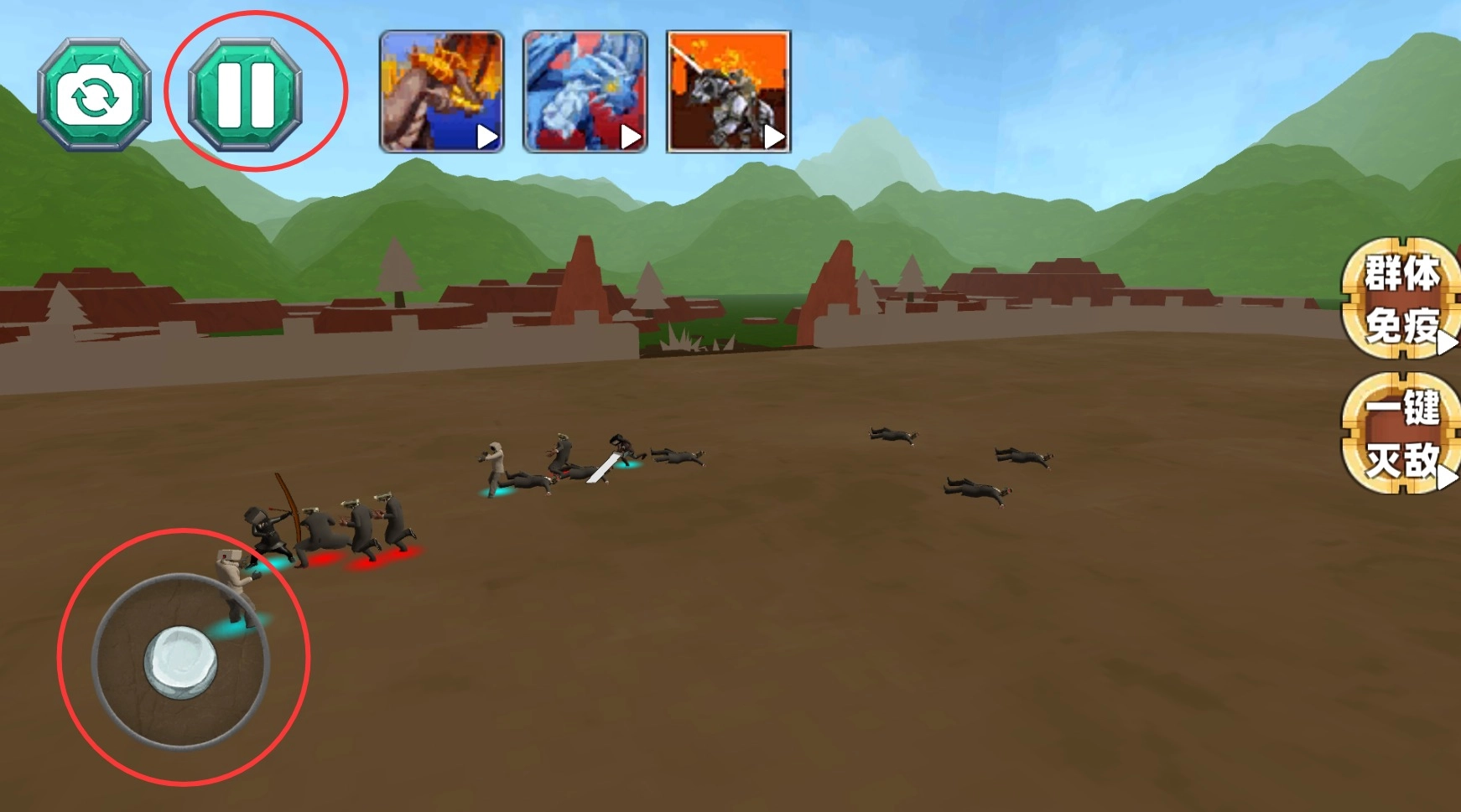 2、战斗过程自动进行,胜负关键在于部队选择和站位布置。界面左侧提供暂停和视角调整功能便于观察战局。