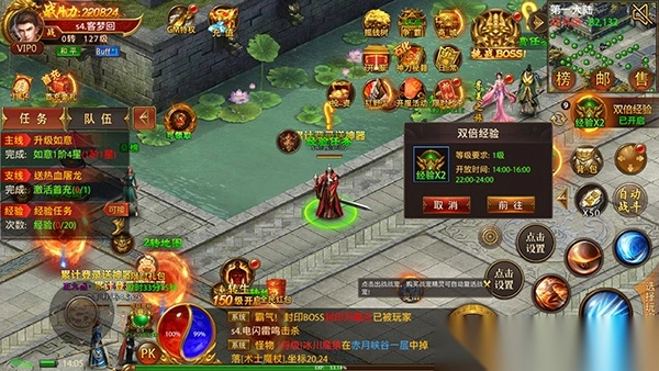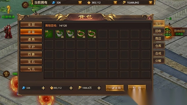 2、游戏开始后,跟着主线任务,可以获得大量游戏经验,快速的提升人物等级;后续也可以经验任务、天书任务、悬赏任务、石墓烧猪、膜拜城主、挑战BOSS、离线探险、装备回收获得大量游戏经验,进一步提升人物等级