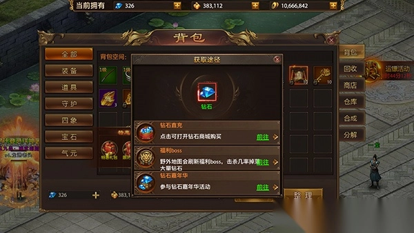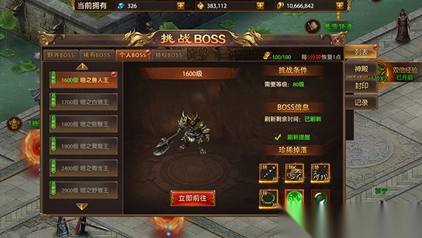 4、游戏中装备是提升自身实力的一种非常重要的方式,在个人BOSS中可以优先获取游戏前期需要的各种装备,当等级提升起来后就可以在玛雅神殿,特权BOSS,转职BOSS,幽冥BOSS,神界BOSS等游戏活动中获得大量高级装备