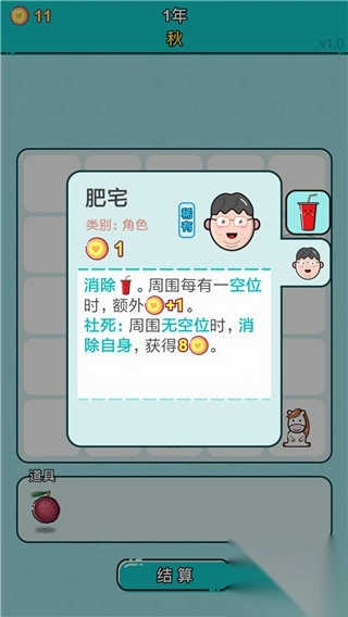 2. 当肥宅所处环境周围没有空位时,它能够自行消除,同时可获取八个金币。