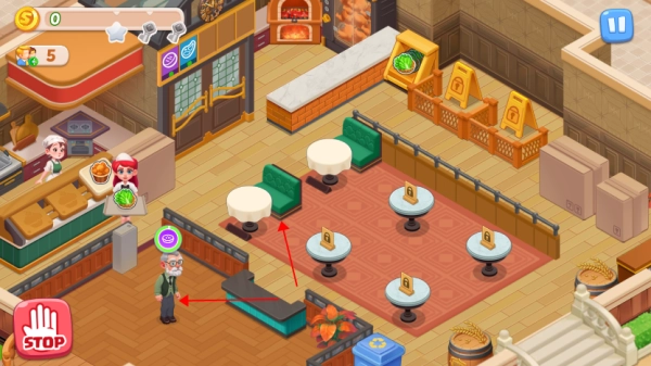 4、点击餐桌上的“厨师”标识,接着依据客人所需的配菜,先点击配菜所在位置,然后点击客人,按照顺序进行送达。