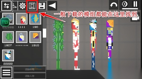 8、进去后点击小三角,再点倒数第二个按钮,正常来说往下滑就能看到下载的模组了,用手把它们拖出来亮亮相!
