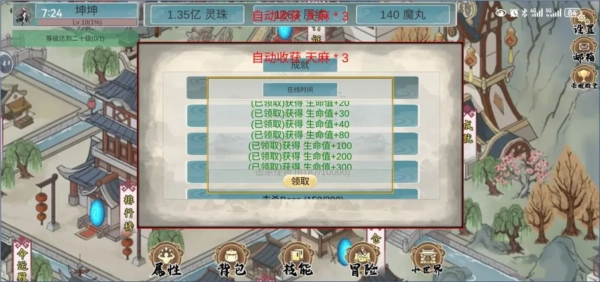 * 挂机收益:太白金精、玄雷铁,每挂机1小时触发“天道威压”考验。