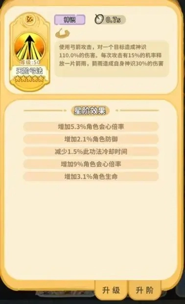 4.4 功法升阶:升阶可以随机获得属性加成,重复的功法可用于升阶刷词条。一般主C弟子选择会心倍率(若为天道弟子缺乏会心,则选择会心提高稳定性),其次可选择对应主属性加成等,坦克弟子选择会心倍率减免、生命、防御等属性加成。