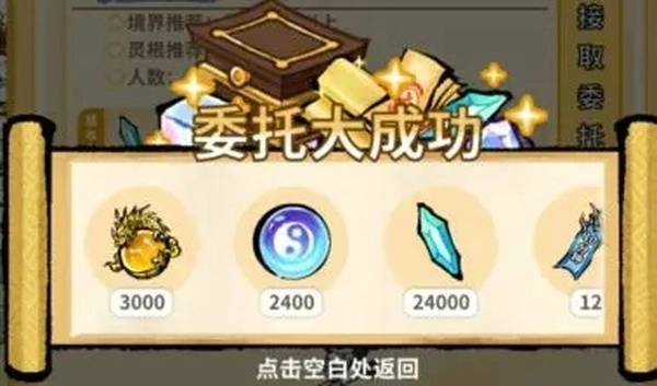委托板主要用于获取五色奇物,灵石数量较少,但在前期可作为补充。委托必定成功,获取基础收益,在委托弟子满足灵根和境界要求时可以大成功获取双倍收益。在抽卡时可以保留性格为喜欢委托的弟子加速委托(适用于肝帝)。