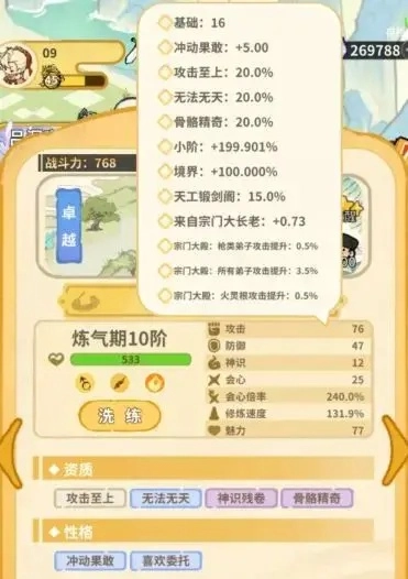 3.2 性格:主要影响各项基础数值与生产速度,其中第二性格必定只影响生产速度,一般建议战斗弟子第一性格洗练主要属性,生产弟子一般不投入孟婆汤洗练,而是选择生产之神(40%全生产速度)弟子使用。