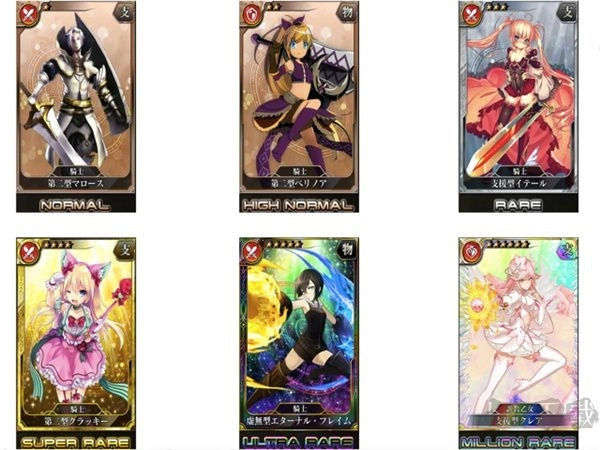 本游戏中的稀有度共有6种,分别为NORMAL、HIGH NORMAL、RARE、SUPER RARE、ULTLA RARE、MILLION RARE 。另外,卡图上的星星数是稀有度的标记,依据稀有度分为1 - 6颗星。