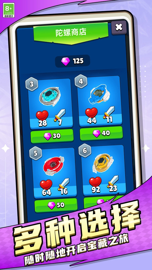 2、有多种不同类型的陀螺供玩家选择,包括速度型、攻击型、防御型等。