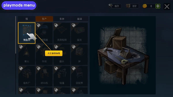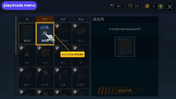 4、进入菜单中打开生产选项卡,点击捕鱼网。
