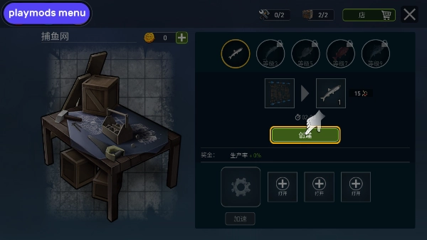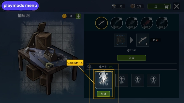 6、这个网是用捕鱼废料制成的临时网,创建完渔网之后并不能马上使用它捕鱼,需要训练过后才能使用渔网捕鱼捕鱼需要时间,点击创建生产鱼吧。