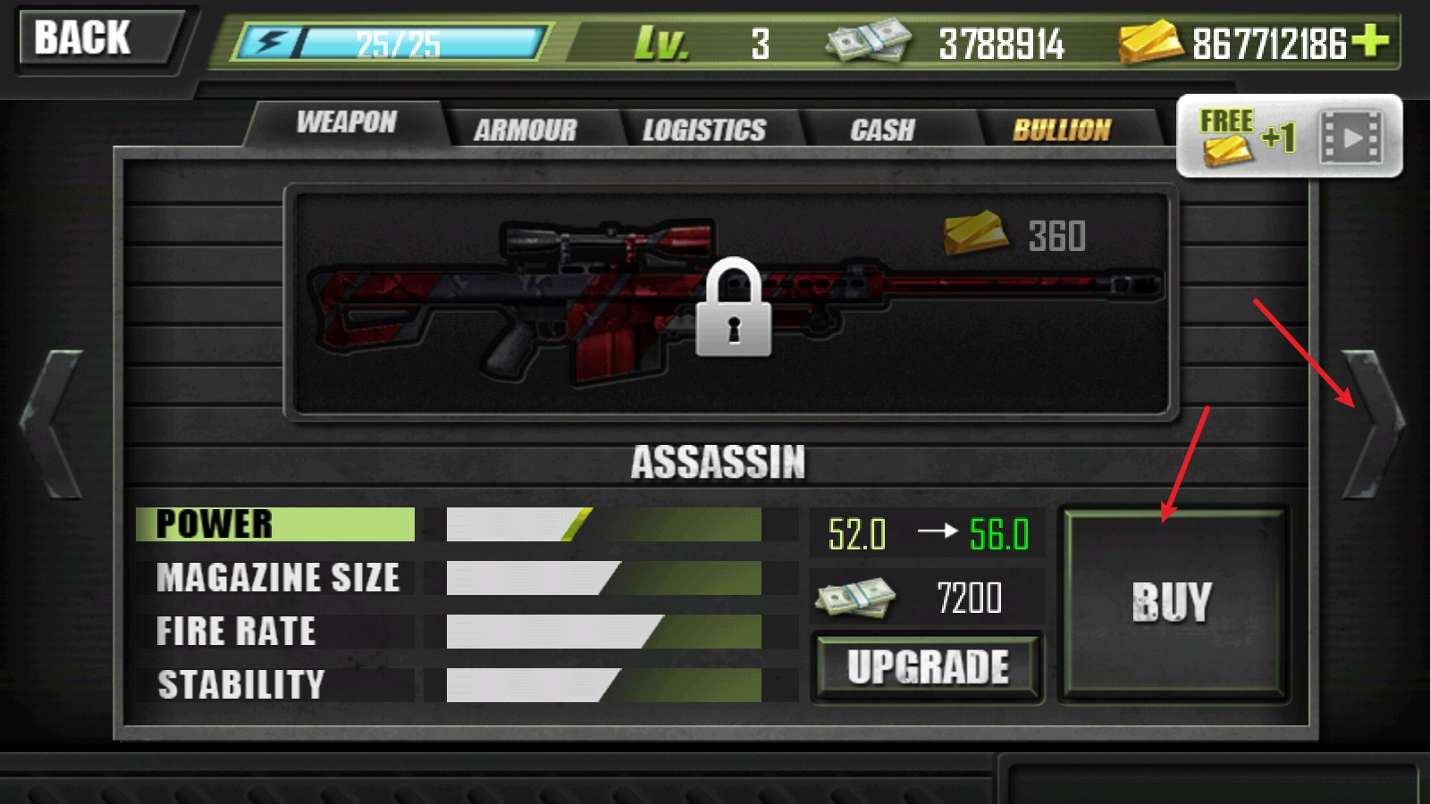 2、进入之后,点击箭头就可以切换各种武器进行购买。