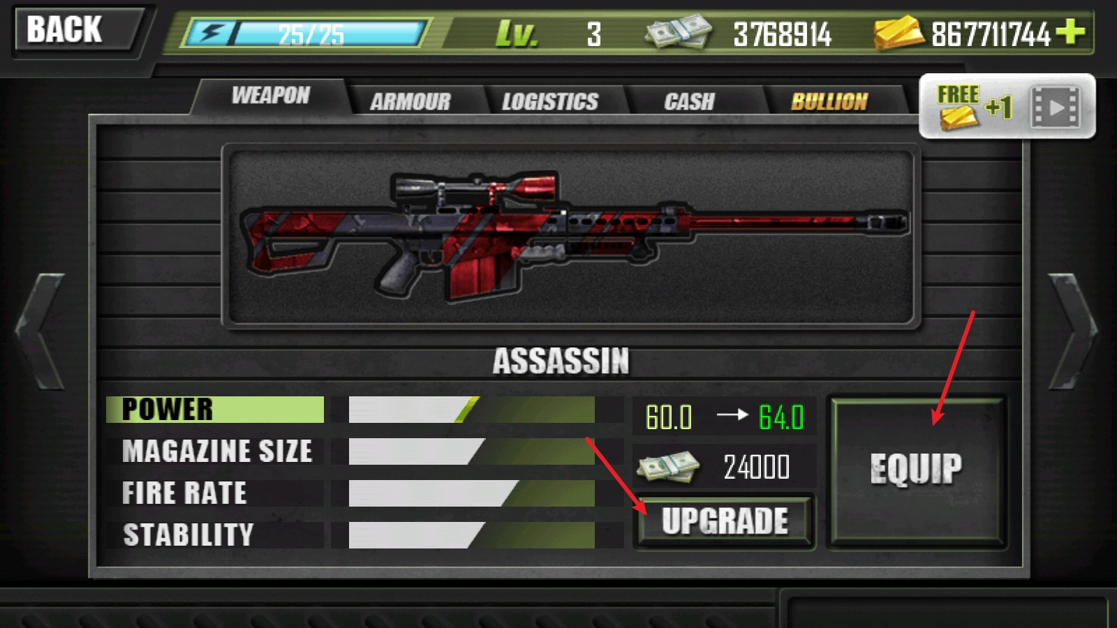 3、购买了之后就可以点击EQUIP进行装备,还可以对其进行升级呢。