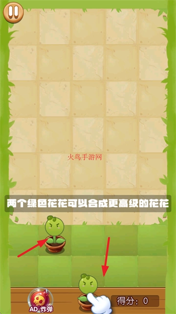 4、把两朵绿色花花合在一起,就能得到更高级的花花,随后便可以开启闯关啦。