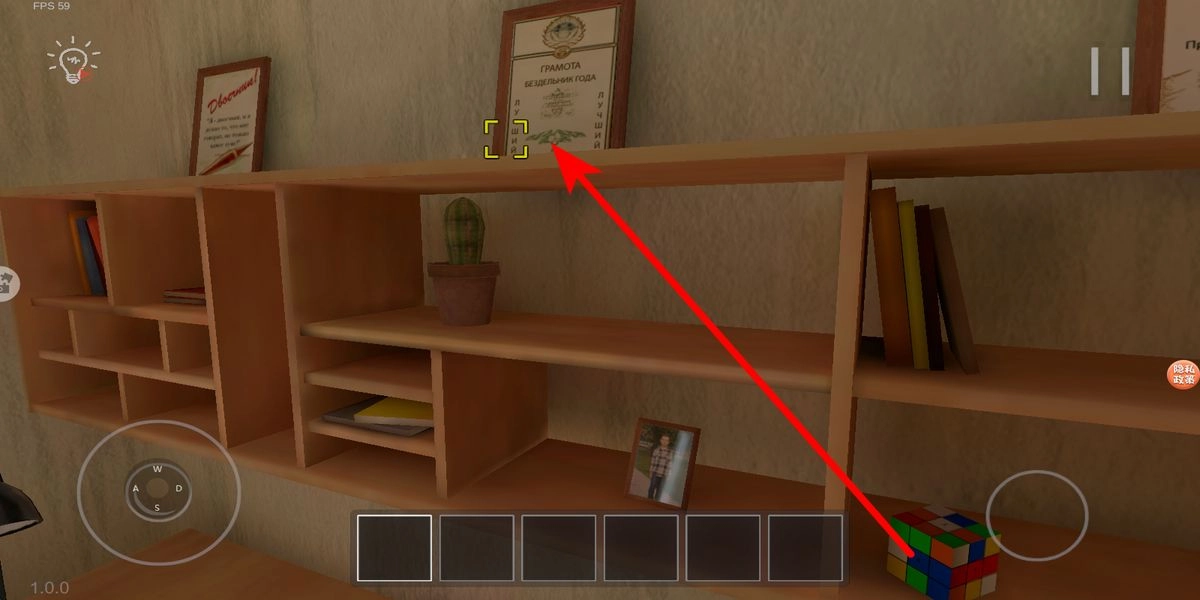3、书架细节排查聚焦书架区域,检查上层证书的互动效果,查看中层盆栽周边,点击下层书籍、魔方及相框,从中发现隐藏线索,助力逃生谜题。