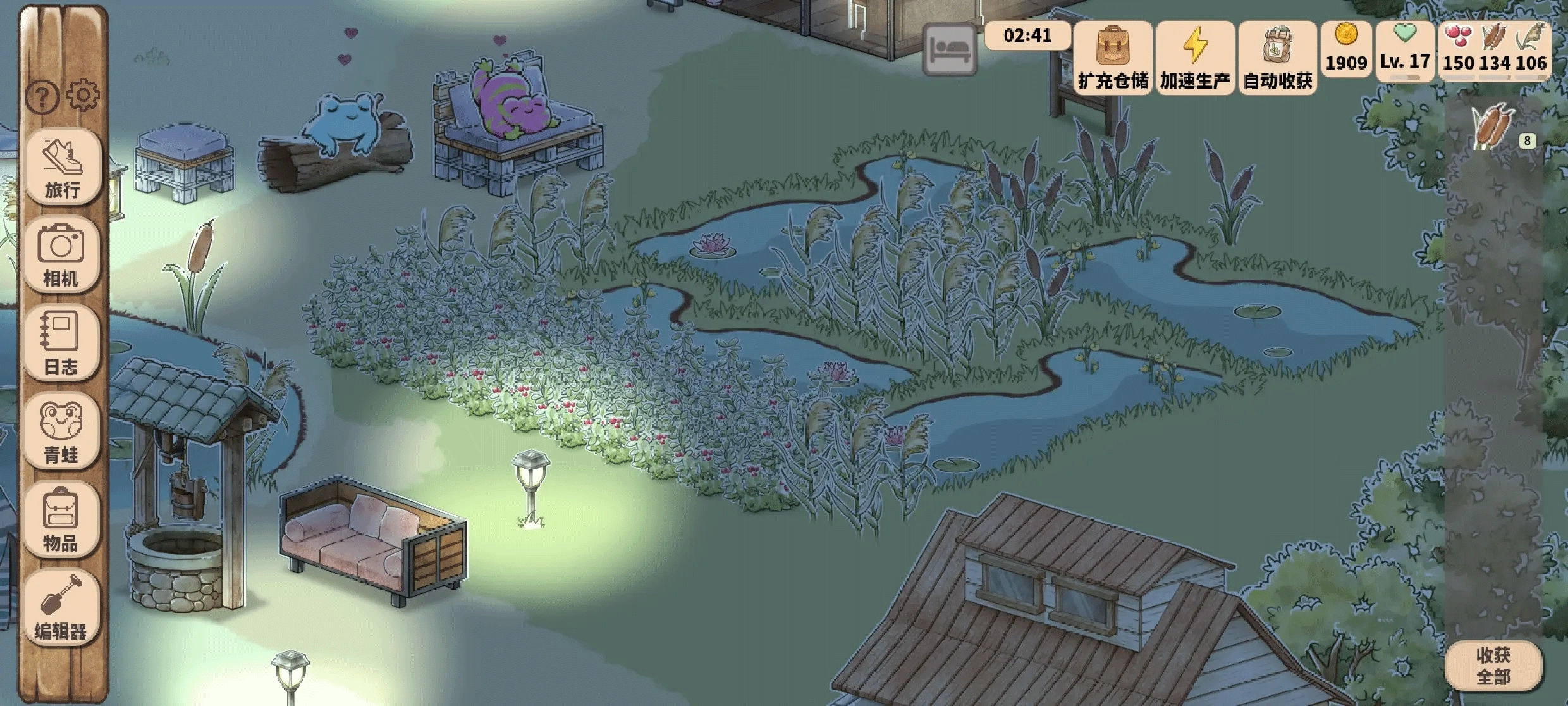 挖掘池塘,使水重新覆盖大地;栽种本土湿地物种,收获珍稀作物。随后,你能够把采摘的物品转化成商品并进行售卖,以此进一步优化青蛙的栖息地!