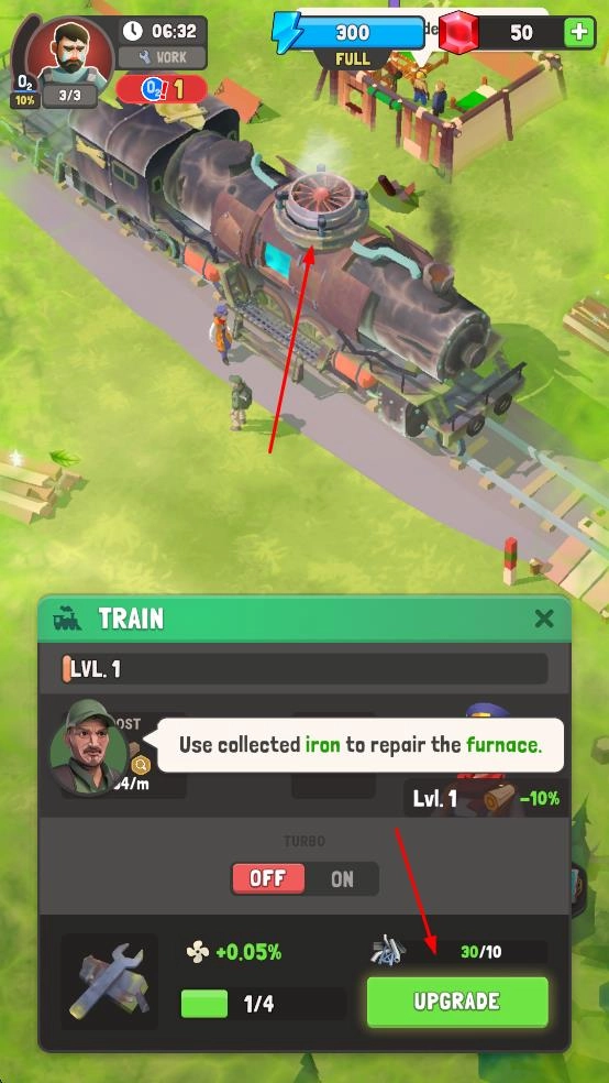 1、点击火车,消耗收集的铁满足进度,点击UPGRADE,升级火车熔炉。