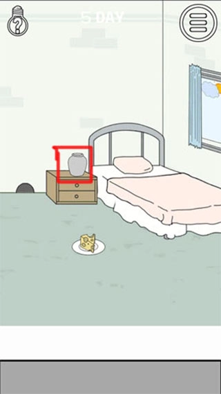7、到右侧拿到石头和钥匙,再到左侧把石头压在桶上。用钥匙将柜子打开,把被子移开