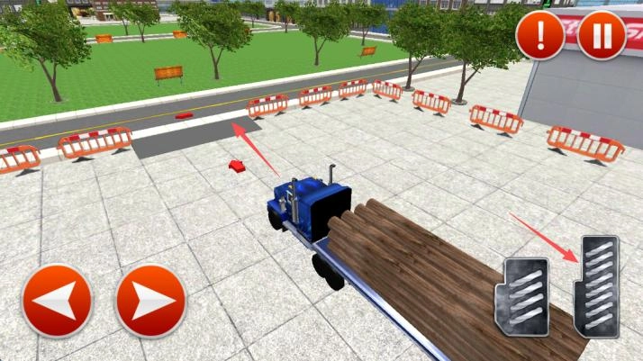 1. 在操控卡车时,顺着【红色箭头】所指方向,借助右侧的【加速按键】,朝着广场的【橙色护栏】区域行进。