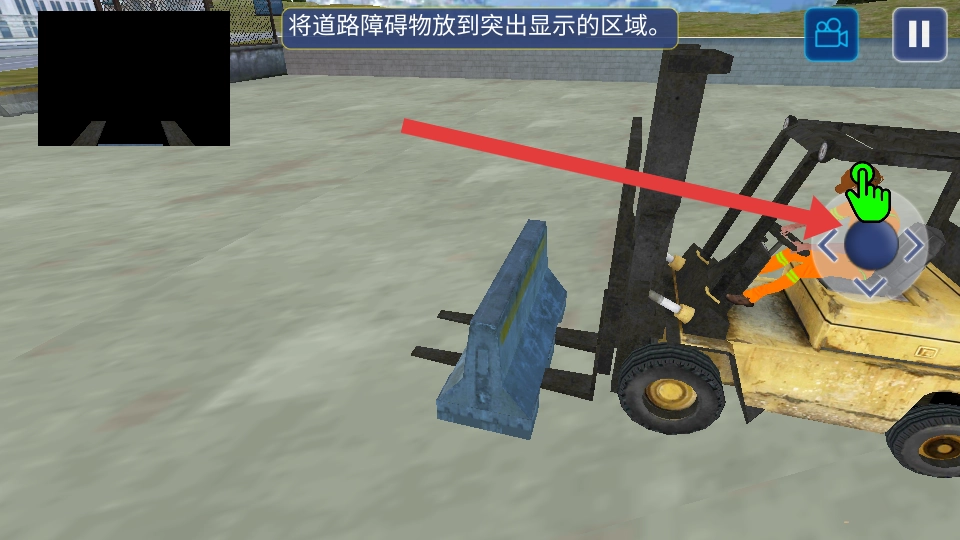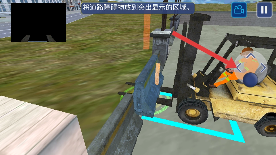 2、完成停车任务后,切换搬运道路障碍物,操控叉车叉起障碍物,将障碍物精准放入蓝色框内,完成搬运。