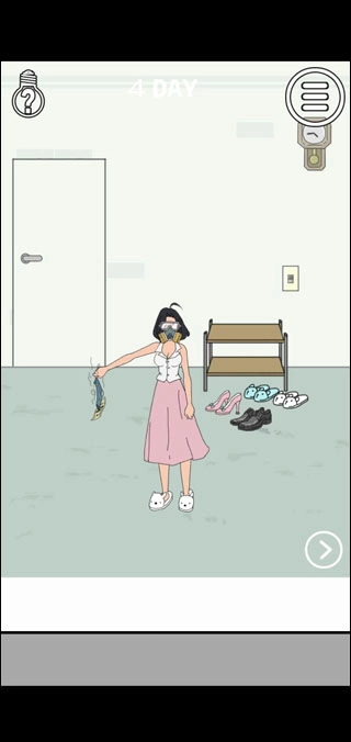 第四关,和第三关一样的是图中共有两个房间而此时的私房钱就藏在了老公的袜子里,由于气味的异常,你需要去往下一个房间打开衣柜获取防毒面具,再回来刚才的房间点击男士鞋,拿去袜子,获取私房钱。