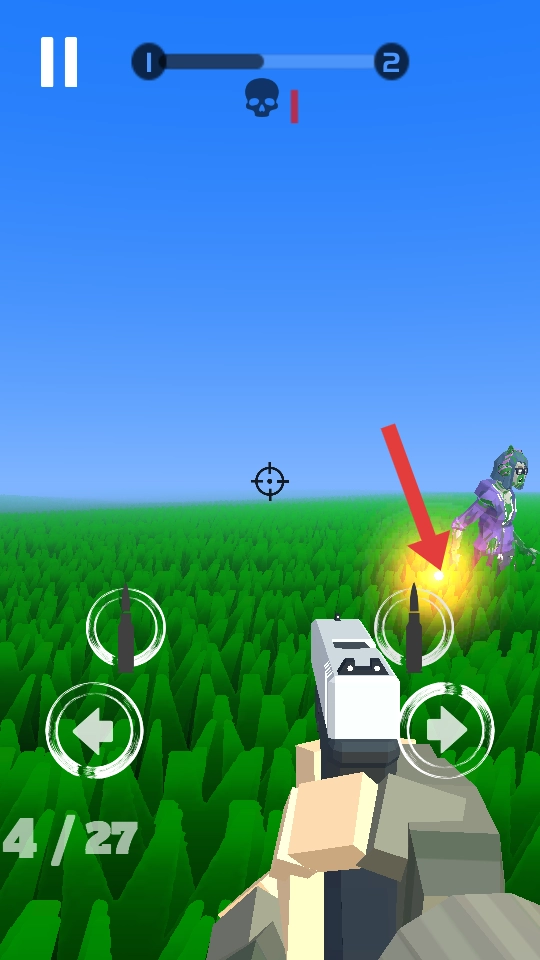 2、留意子弹数如4/27,打完及时换弹,遇到持盾僵尸带金色盾牌,瞄准头部或绕后攻击,避开正面的硬刚。
