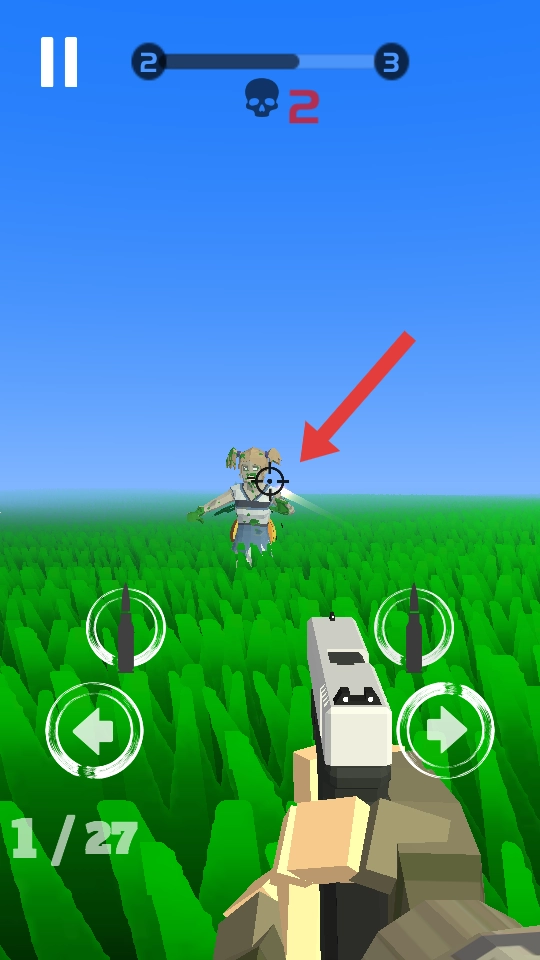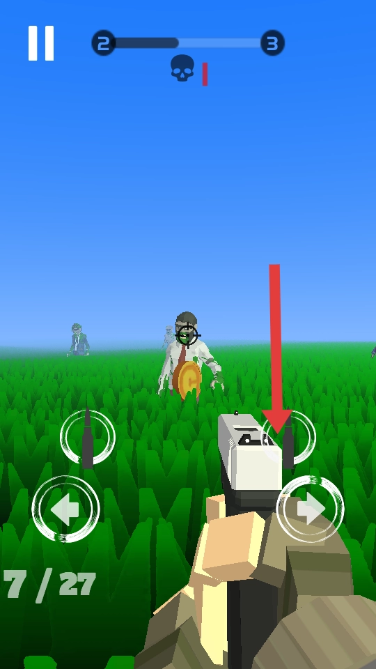 1. 开启游戏后,通过左下角的摇杆来进行移动与方向调整,将目标对准绿色草地中的僵尸,接着点击射击按钮开枪,射击时优先选择近处的目标。