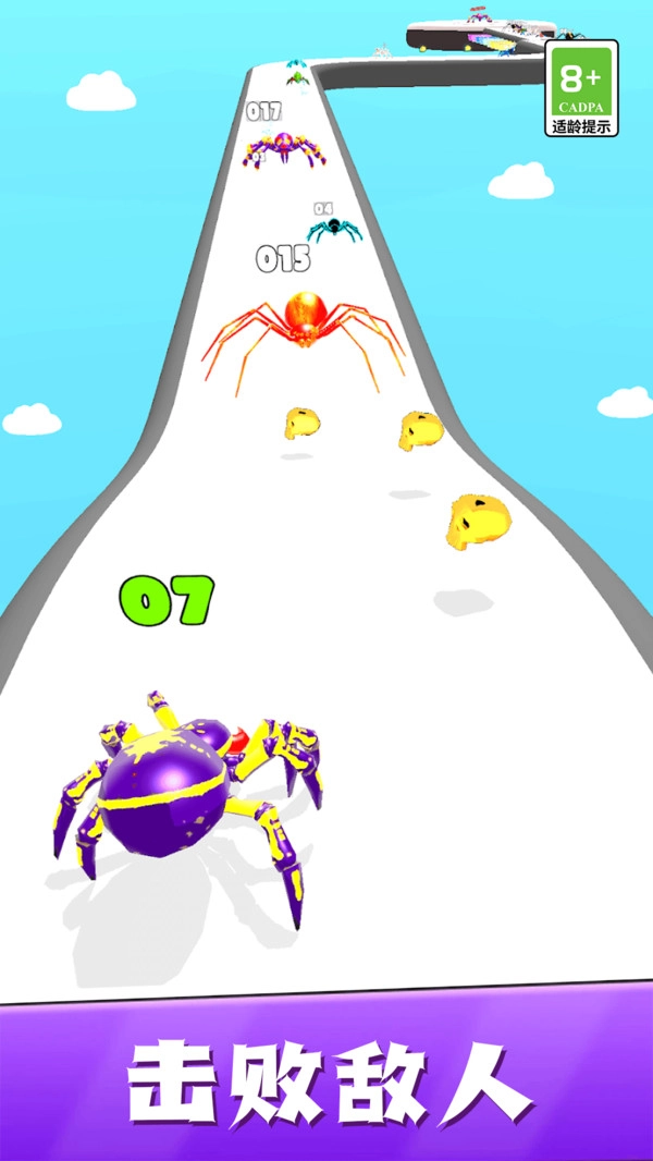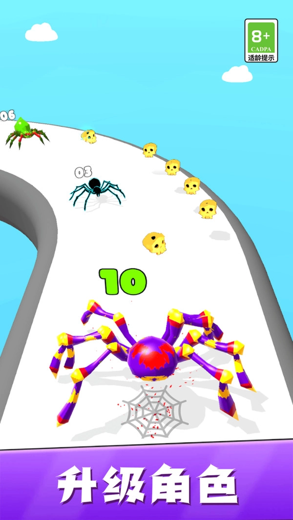 2. 吞食弱小蜘蛛,避开危险的大蜘蛛,持续提升你的战斗力。