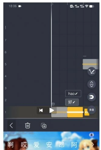 5、调音的时候按着简谱上的数字在屏幕对应的位置点击就行,可以直接点击先按按感受一下,准备好了之后,点击右下角的录制按钮,进行调音。建议选择左下角的倍速调成0.5,不然太快了,按的慢,使得后期工作量增加。注意简谱中的—代表前面那个数字长按。如果唱错了,可以向右滑动,点击右侧x删除唱错的歌词