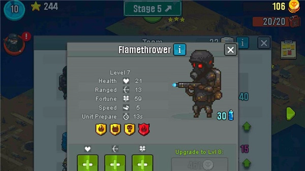 1. 喷火兵具备防感染、防火以及防弹的特性,其在死亡后会发生爆炸,并且能够点燃敌人,使敌人遭受持续伤害,推荐优先对其进行升级。
