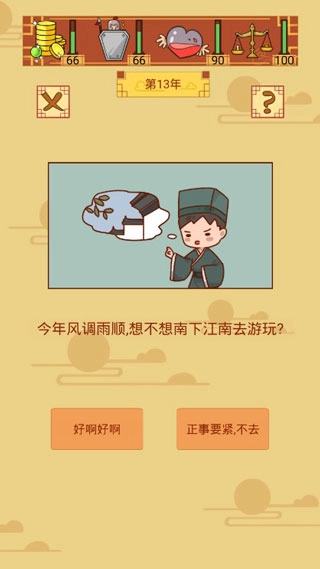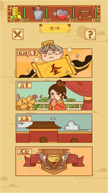 游戏的玩法颇为简单,只需保证四项数值,即国库、军队、体力以及民心,不低于0就行。