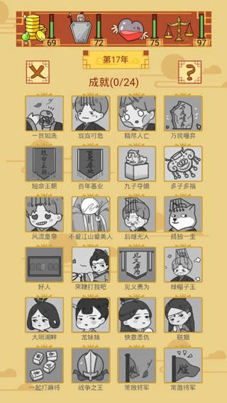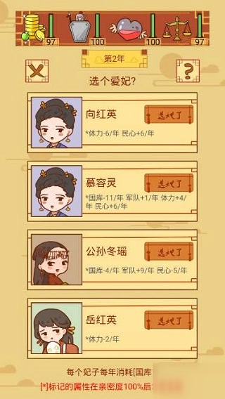 此时你可以开启一局游戏,开局后挑选一位妃子,接着努力生出属性高的孩子,有三到四个高属性就可以收手了,要刷出四个高属性的孩子难度挺大的,像我这种运气不好的人就很难做到。之后再找一位妃子,最好能让孩子的四个属性都能发展良好。