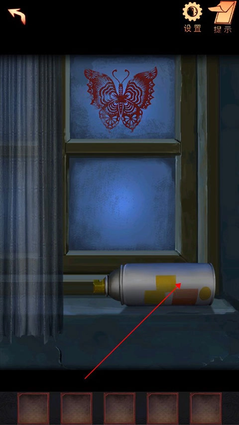 6、轻点窗帘,获取道具喷漆罐,同时得到线索——红色的蝴蝶。