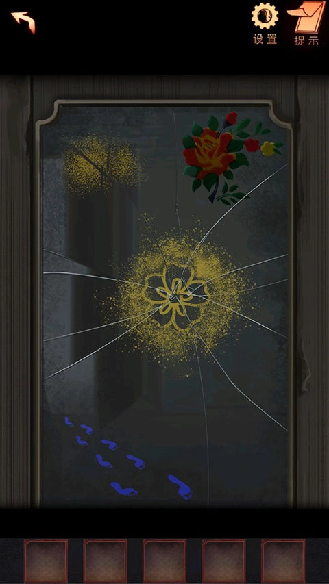 8、轻点衣柜上的镜子,拿出【喷漆罐】使用(此处有轻微惊悚点),随后得到线索:黄色的花朵,蓝色的脚印