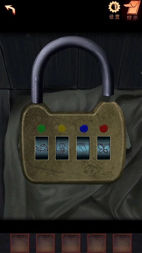 10、轻点床上的文具盒,依据文具盒上的颜色以及挂历、窗户和镜子上图案的颜色,对盒子上的锁进行调整(绿色瓢虫、黄色、蓝色脚印、红色蝴蝶)