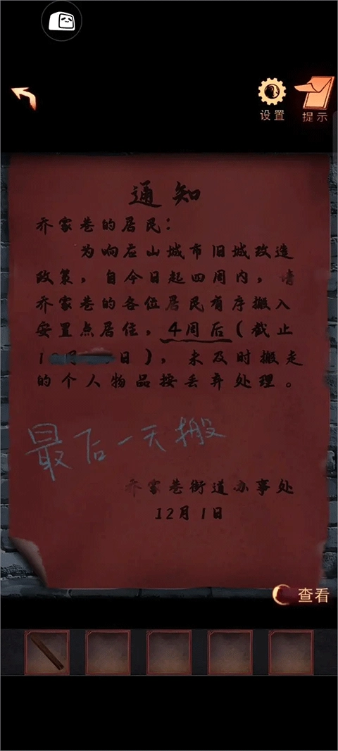 2、点击位于巷子中间且被钉上的门,查看贴在墙上的通知(从12月1日起,过四周后的日期为12月29日)