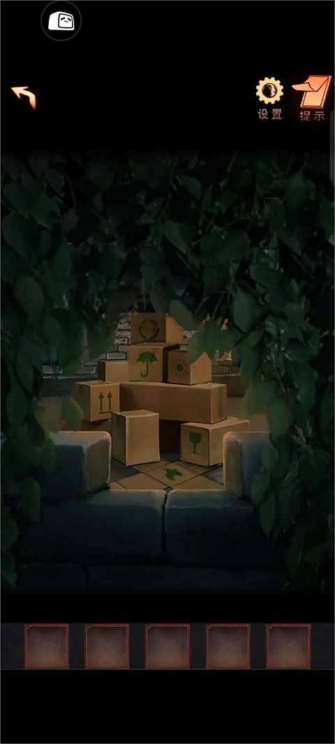21、轻点墙上的漏洞,仔细查看院子里放置的纸箱子上图案所处的位置(此处有小高能预警)。各图案对应的序号为:火苗 - 1、酒杯 - 2、箭头 - 3、雨伞 - 4、太阳 - 4、循环符号 - 5 。