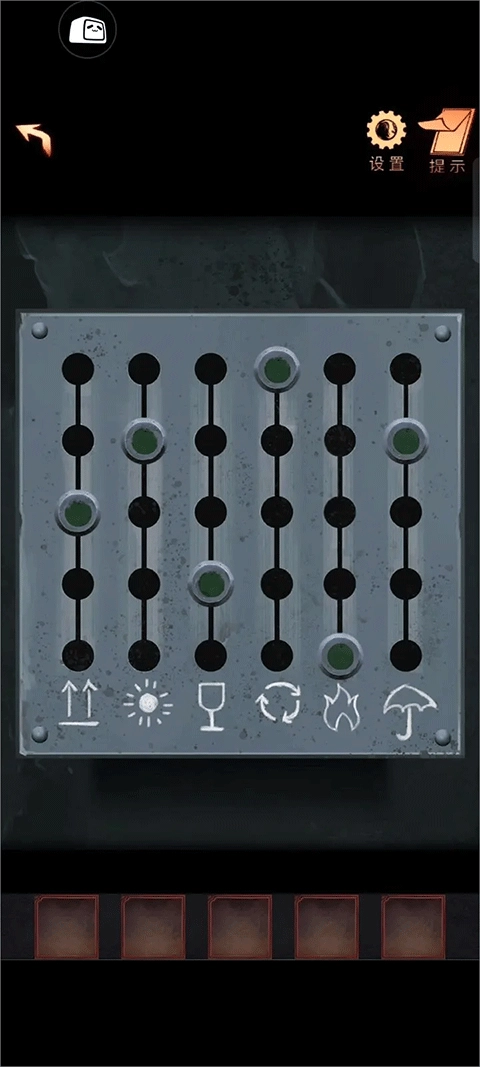 23、依据院子里放置的纸箱子上图案的位置,来调节机关上相应图案滑块的位置(火苗:1、酒杯:2、箭头:3、雨伞:4、太阳:4、循环符号:5 )